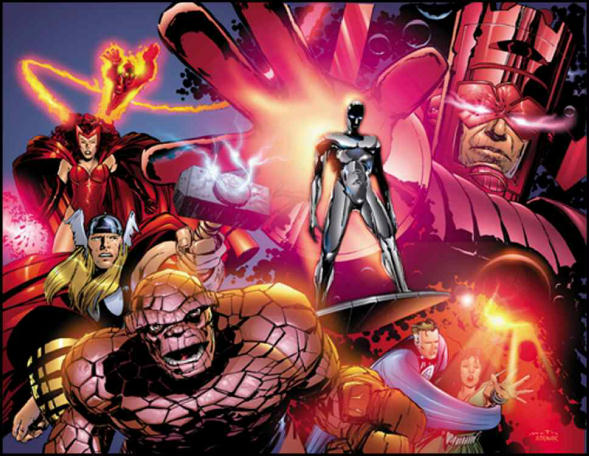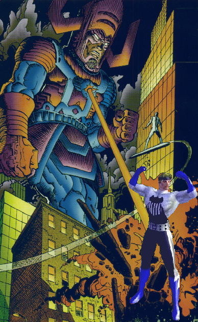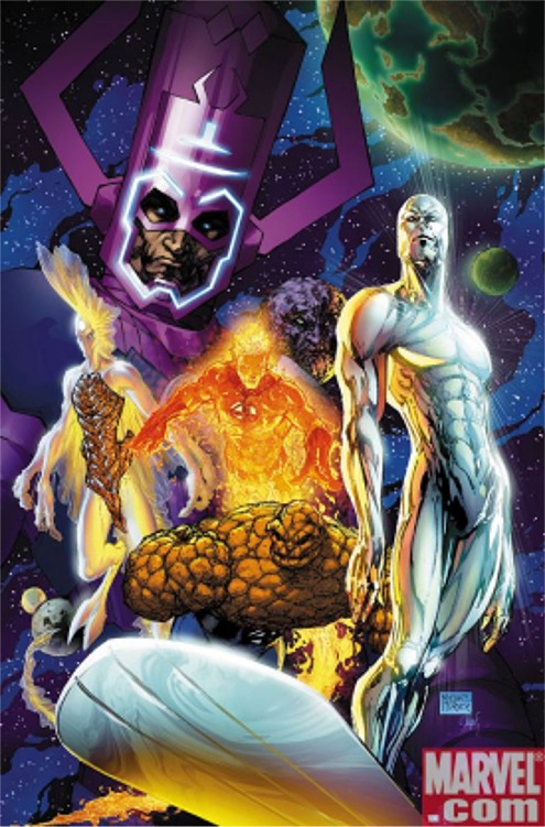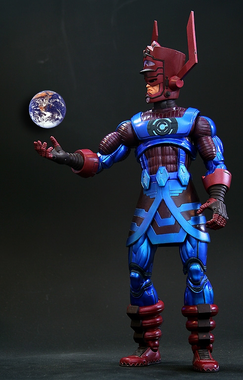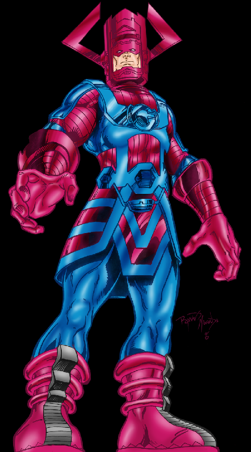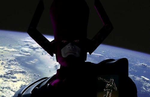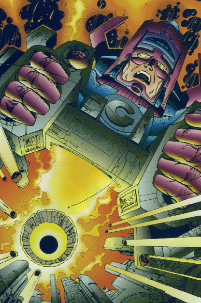 Where a handful of these images goes wrong for me (aside from the weird addition of goo-gads and whatzits) is the range of emotion on Galactus' face. He should be stoic and inscrutable. Frankly, I'm not even fond of him looking directly at mortals, since it suggests him giving them more of his attention than he should. Mortals, even super-powered ones, should be little more than gnats in his opinion. And you don't outwardly seethe or scrutinize a gnat. You just swat it and keep on with what you were doing before it annoyed you.