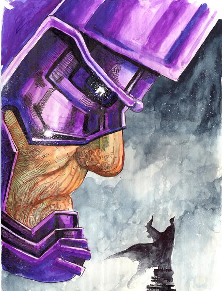 Come on, guys! As if Batman doesn't have the Ultimate Nullifier in his utility belt! Superman, the Martian Manhunter, and Wonder Woman are off fighting whatever Herald(s) preceded Galactus, and the robotic Punisher that once took on the FF is now busy holding back Hawkman, the Atom, and Zatanna. The Flash ran through time and space to get the Nullifier and he's too tired to do much of anything else at the moment. Clearly Batman has the best poker face to make Galactus believe he'd actually use it, so he gets sent up to speak to the big G. •• That turns it into something quite a bit more than the oft-heard "Batman could defeat Galactus" scenario, doesn't it?