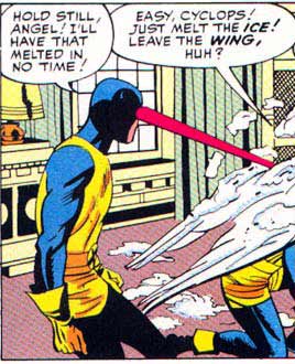 ..."melt"?•• And if the beam had been blue, as Kirby apparently intended, Scott would probably have ended up using it to FREEZE things! In that particular panel, you can tell from the chunks of ice flying off Angel's wings that Jack didn't mean for Cyclops to be using his beam as a heat ray, so we can mark this down as one of those rare occasions when Stan wrote against the pictures, and it didn't work.