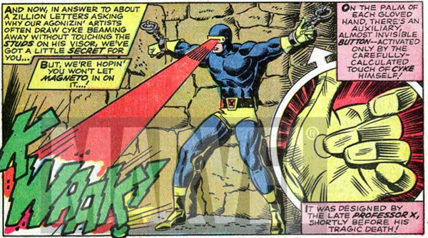 Greg, I know it's written that Cyclops has a switch in the thumb of his glove in Secret Wars #6