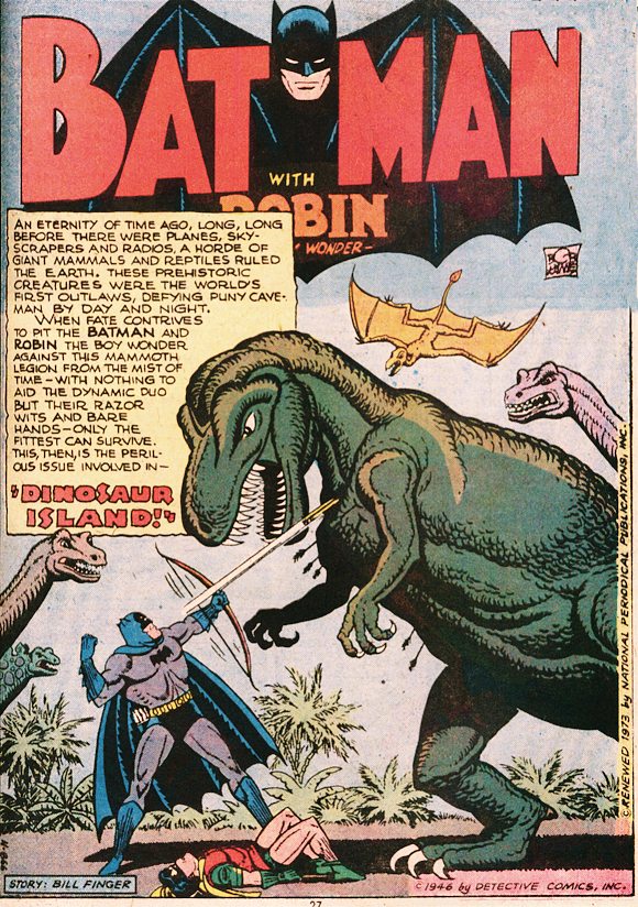 Batman #35- 'Dinosaur Island". written by Bill Finger, art by Kane & Burnley.