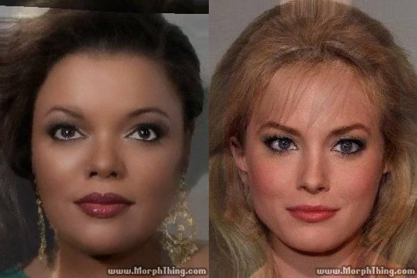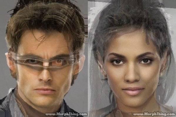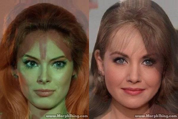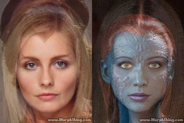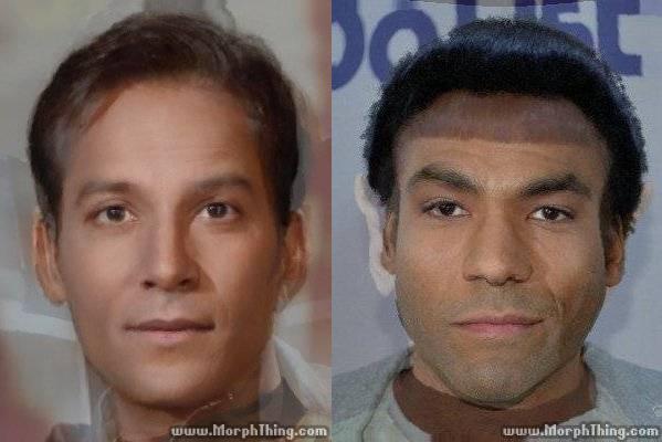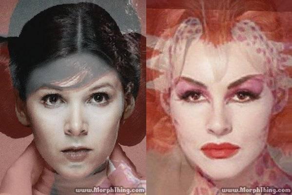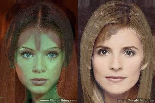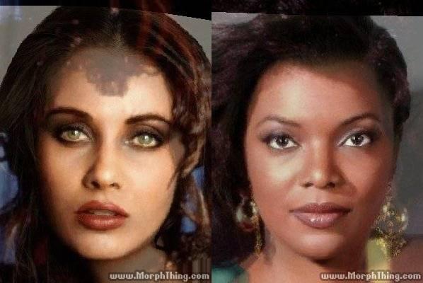 I've done a lot of image morphing of the women from Star Trek. I thought I might do some with the Star Wars characters. As it turns out, though, there aren't that many. There are websites you can go to look up female characters just so you can fill out the bridesmaid side of your Star Wars-themed wedding. Those that do exist often look as if they've been dressed in clown costumes... Although I fannishly suspect that a link between the Trek and Wars continuities can be established through Rystall, one of Jabba's "Special Edition" dancers, and Neelix from Voyager...