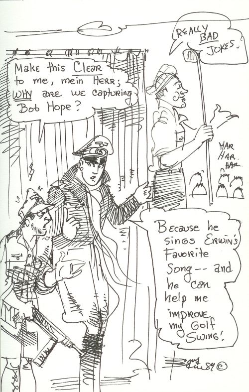 Donna Barr - The Desert Peach & Udo, Norwescon 1989 Short backstory on this one - Unlike the previous autograph sketches which were mainly "artist's choice", Donna asked me what wacky thing I would want to see the Erwin Rommel's (fictional) half-brother & his aide doing, and the first thing off the top of my head was: "Kidnapping Bob Hope."
