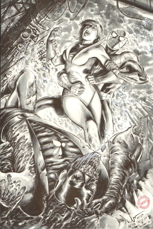 Originally used as the cover for Spider-Man Family #3, this cover optimizes what I love about Spider-Man as well as captures my love for reading. I've always loved Olliffe's physical interpretation of the character, so when I saw this on ebay, I jumped on it. It was only after seeing it in black and white that I could fully appreciate the detail put into the piece!