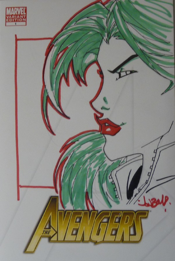 This one would be a little nicer if he'd had a green marker when he was doing the lips. I brought him one after the fact and he did the hair, but the lips (or their color, at least) are a little weird for me. Nobody will ever do her like JB, but I like Jonboy's style as far as recent artists go. She-Hulk by Jonboy Meyers: