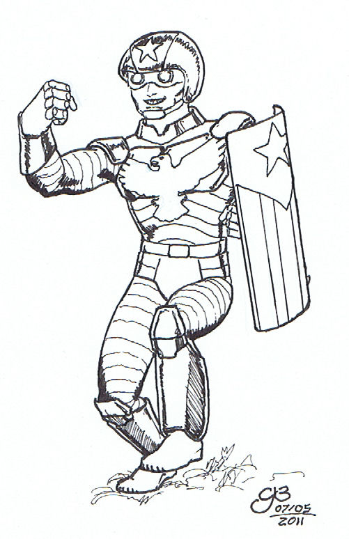 I call him "the American Legionnare", incorporating some aspects of modern military uniforms with the lorica segmata armor once worn by Roman soldiers back in antiquity. The shield is basically a Roman scutum shield emblazoned with the colors of the flag. Blue pencil sketch on Bristol board, inked in with PITT and Micron markers. I plan on filling the rest of the background in, and coloring this to place it on my DeviantART.com gallery.