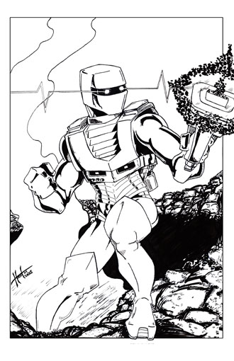 I guess I've been on a bit of a Kirby kick with this one. The villain more or less is a tip of the hat towards those bulking monsters that the King used to draw back in the day. I have him calling himself "Mokk, Sone of Rokk!", with a whole string of descriptions trailing along to let everyone know what he's done so far. Not that it impresses the girls who rise to the occasion of defending the Earth on this instance. I'm making some modifications to my method here, too. I actually drew the dialogue balloons and sound effects this time, and added the dialogue in Paint Shop Pro after some cleaning up and tweaking. I scanned the image at 200 ppi as well, giving me more detail to work with. This being a resized line art copy, the original scan will be colored and added to my DeviantART.com gallery.