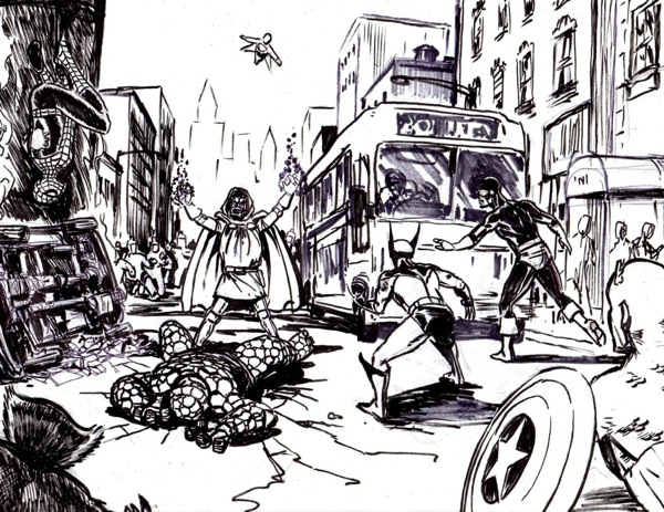 I've begun sketching my attempt at the splash page from X-Men #107. This is by no means the final version.