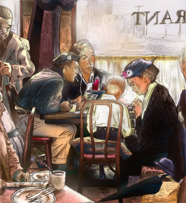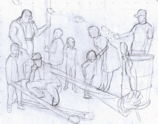 Here are the initial pencils, establishing the composition and blocking in all the characters: