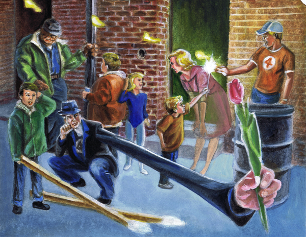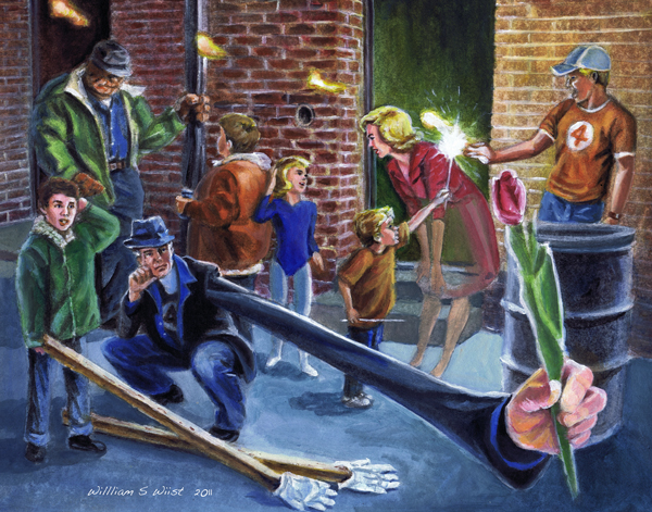 That's a whole lotta fun, Bill! There is something about the mood of the scene that is really interesting. I think becasue they are in street clothes, it makes you look twice - at first glance it is a normal street scene, but then you see there is something very abnormal about this very normal looking scene.