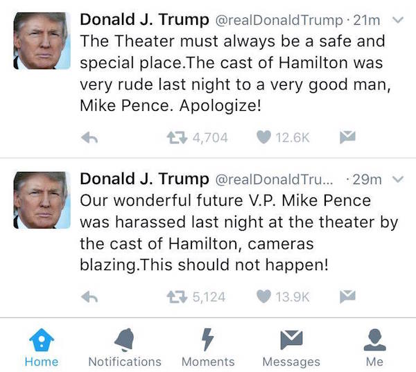No matter what anybody says about him, he has far more pressing demands upon his time than to be goofing off on Twitter about perceived slights. I hope he realizes this what the cast of Hamilton did was as polite as polite gets. He's in for far worse on a literally a daily basis. Good thing he has a thick skin!