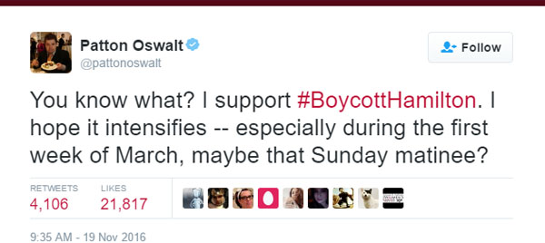 | These idiots aren't going to Broadway shows, and they're not getting tickets to Hamilton in any case. I'd suggest they save their breath, but raving about non-issues is how they make themselves feel important. |