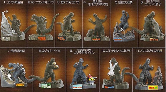 Speaking of those little Godzilla set pieces, I have one. It depicts Godzilla kicking at the buried "egg" in GODZILLA VS MOTHRA, shown here second row left.