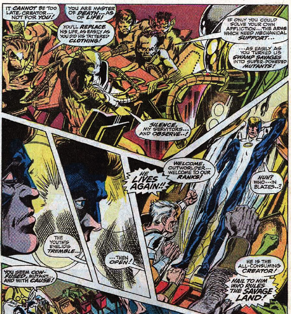 Long have I maintained that the Big Reveal at the end of that issue (That the "Creator" was, in fact, Magneto, showing us his face for the first time) was a surprise to Roy as much as to the readers. Reading that issue with the clarity of hindsight, there is a distinct sense that the pages were being sent in and scripted in a tearing hurry, with no chance to edit or modify dialog already written when later pages arrived. The line "…arms which need mechanical support…" does NOT describe the Creator's "affliction", and his mutates would KNOW that. But I don't think Roy did! Roy says this is not the case, and everything was plotted beforehand, casting Neal pretty much as Art Robot -- a most unlikely role, all things considered!