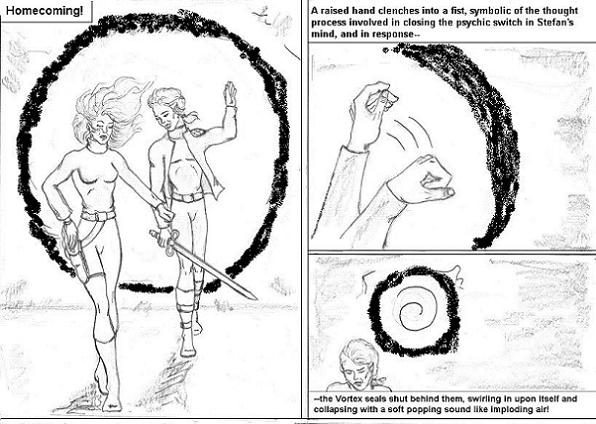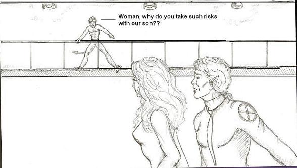 The story takes place where the Nightcrawler mini-series took off...with Mephisto's implied threat of world domination. It is the year 2021, and Kurt and Elissa have a son named Stefan, who has an interesting inheritance in the way of powers! (D. Cockrum shared his first idea with me as to whom he wanted Kurt's father to be originally...and that was Nightmare! Did you know that nightmare in German is the word Albtraum, which translates to elf-dream? And who is called an elf constantly other than Kurt? Also elves in Germanic lore are tied in with changelings, and in German lore, you get rid of a changeling by throwing it into the river in the hopes of finding your real child! What did Mystique do but throw the infant Kurt into the water? It all fit too well, and I don't know if Dave realized it! So Nightmare in my universe is Kurt's father and adds to the story immensely since Mephisto is a supernatural demonic type too! Stefan generates vortices to travel interdimensionally, and can see into the spiritual plane, dividing truth from fiction...i.e.-what is a true spirit or a physical aberration of a lost soul. Stefan is part alien and part mutant.Elissa is from an alien world where the mutant population is bound in a telempathic community by what I termed the Binding, so Stefan shares in that heritage, as well as Kurt, because when you become one with a N'hilrain (Starclan) you become one in the Binding!