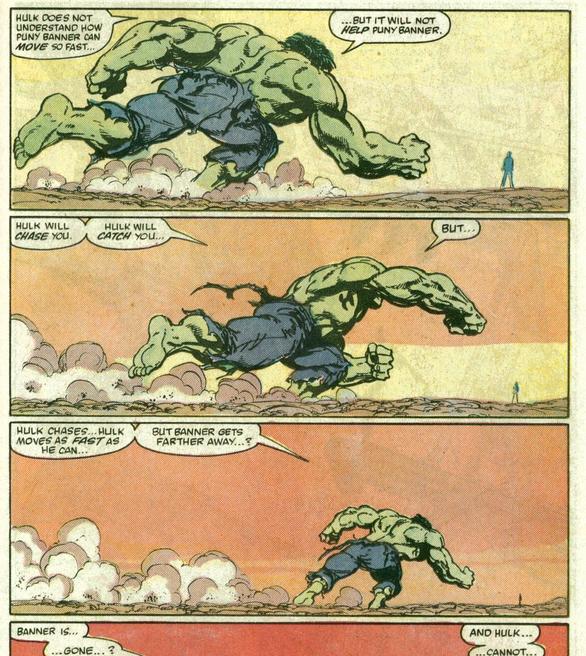the 2nd example is a dream sequence, though, so it's Banner's a distorted view of reality. hence, the awkward running motion of the Hulk is JB's way of letting the reader know that something is different.