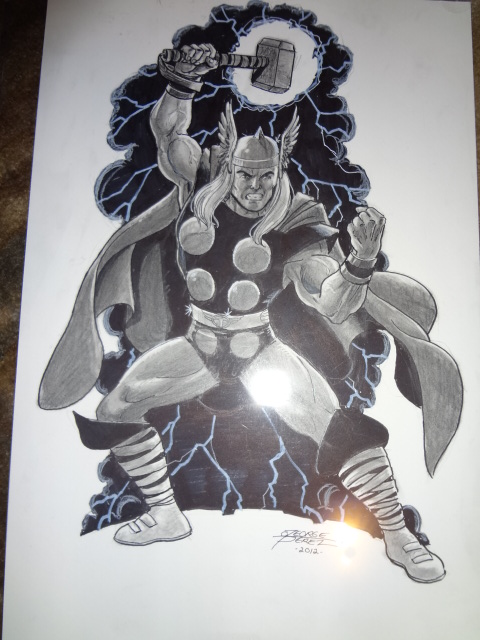 A few months ago George Perez posted on his Facebook page he was attending the Cincinnati Comic Expo and was taking pre-commission orders, I put in for one but never heard back from him and I just assumed that he had met his quota. Weeks later I recieved a message from George saying that somehow my message to him was sent to a different folder in his account and that he felt that it was unfair that this happened ( although he was booked up for that show) and he would work me in at the last minute..........what a great guy. I couldn't be more pleased from what I picked up today, The Mighty Thor. It was a pleasure to meet such a gentleman and class act as George Perez.