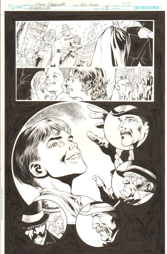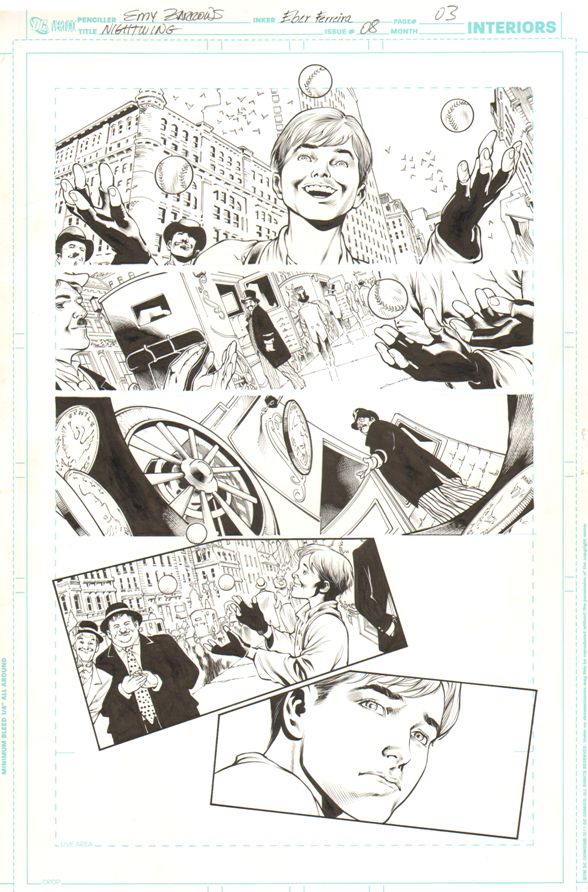 This is the second. Fun fact is that since these are flashback pages of Dick Greyson's ancester, Eddy added three familiar faces from the days of early filmmaking. DC, ever lawsuit-cautious, tweaked the final images digitally to change the facial features....