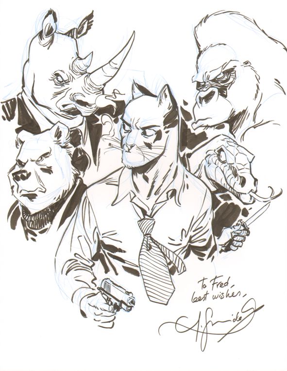 I became aware of Blacksad at the 2011 Harvey Awards and the discovery of this European import alone was worth the cost of admissionisThis crime noir book is not only a a very well-written story, but Juanjo Guarnido brings the anthropamorphic characters to life, leaving you convinced with each gesture and facial twitch that they breathe. I became an instant fan of the artist and was floored to see him at NYCC 2012... and accepting commissions. I was psyched with the results!