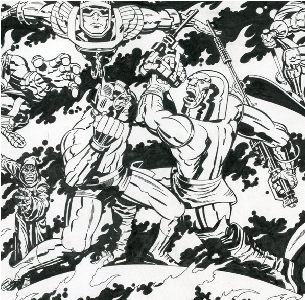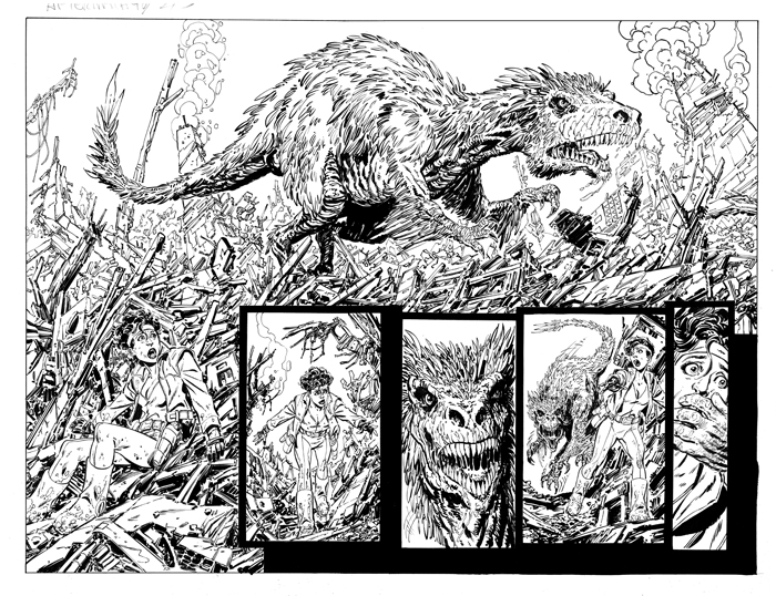 The exception was in the JURASSIC PARK miniseries, where I was doing "widescreen" layouts on all the other pages, and used the three double page spreads to create a "3D" effect. ++ Is the art below a waste of a double page splash? •• Yes. Art is a learning process. When I offer my "sage council" it is based on forty years in the business, NOT a claim that I have ALWAYS done it right.
