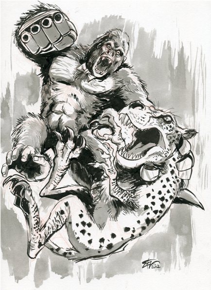 This is Junior Cobbb vs a Chee-Rex (cross between a cheetah and a T. rex) by AXE COP artist Ethan Nicolle.