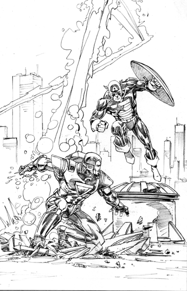 I like the dynamic element Mark Bright has brought to that piece with the energy trail from Iron Man's flight. You really feel the thump of him landing.
