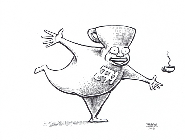Thanks, Bill. She is great and the good news is, there is new Elfquest on the way! Another cartoonist I wanted to get something from is Shannon Wheeler. I really enjoy his Too Much Coffee Man comics and he is also a frequent contributor to the New Yorker. He did this piece for me before the con.