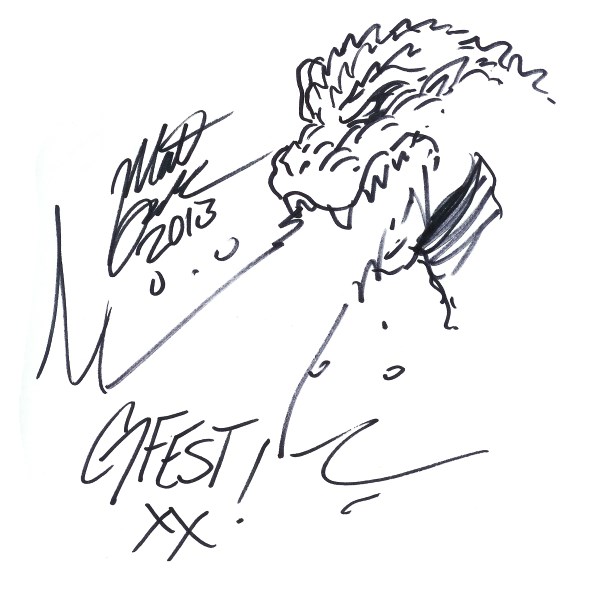 I was G-Fest XX in Chicago over the weekend. Had a nice family reunion with the 2011 Japan tour members, including Martin Arlt and his wife Pam. Matt Frank, artist on IDWs GODZILLA: RULERS OF THE EARTH comic book was in artists alley, and was generous enough to do an autograph sketch: