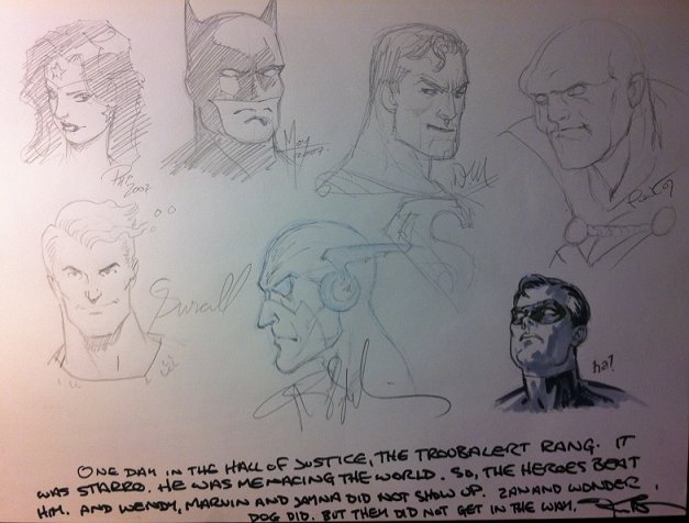 Now that my login works again after a couple years, I get to share some art! YAY! Here is a JLA jam I got a few years ago at the St Paul Comicon in 2007. Sorry for the photo quality. It is too big for my scanner. I honestly do not recal who drew Martian Manhunter or Flash. I even got a story for this adventure by Kurt Busiek!!