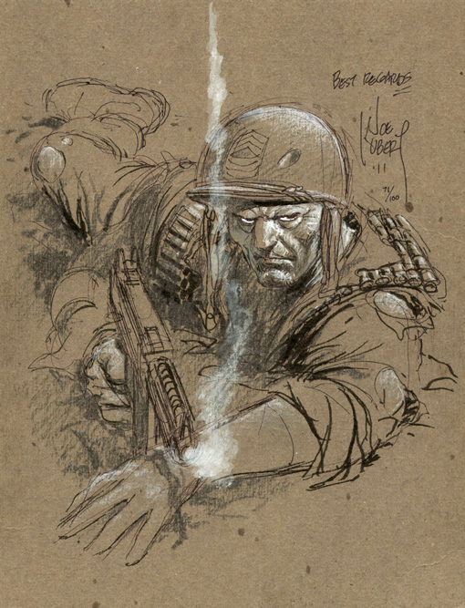 Many thanks to Dave Aikins for letting me know that Joe Kubert's World of Cartooning was offering special sketch editions of his new book Joe Kubert: How to Draw from Life. Sgt. Rock was an easy choice (no pun intended) as my favorite Joe Kubert character, so I placed an order right away. A few short days later, the following sketch arrived tucked inside the book. Joe drew Sgt. Rock in pen and ink on cardboard with chalk (?) for the gun muzzle smoke and the shading on Rock’s face. Incredible!