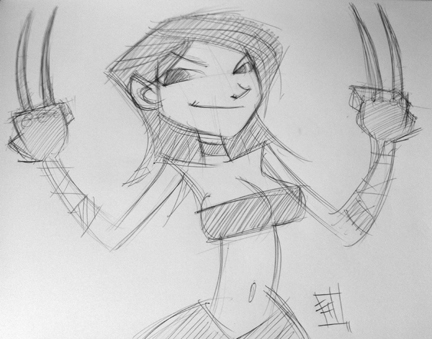 i have a separate marvel, dc, and (for the lack of a better word) indie character sketchbooks and at the beginning of a.p.e. i had only black cat for my marvel book. i have spent about an hour of making a list of characters i would like to see in the book. so what do i do? i gave the artist their choice of character without seeing my list. i just assumed (rolls eyes) that he would pick a classic character since it was so open to pick anyone. anyway erwin went with x-23 (wolverine's daughter? and a modern character) which i have no idea about other than seeing images of her through previews. anyway i learned my lesson and i am actually happy how it came out anyway. i like his style :)