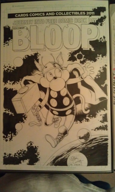 The original art to a poster that Steve Conley did for this years Free Comic Book Day for a local comic store.  The character posing as Thor is Bloop the space monkey, one of Steve's many character's he has created.