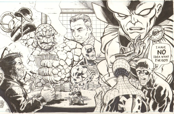 only recently became aware of Tone Rodriguez's prsence on Facebook and then his posted commission work. Immediately enjoying his work, I contacted him and he agreed to produce a piece of art for me. I have become more excited about the Ben Grimm Poker Game theme growing in my art collection and the results that Tone produced blew my mind! all of the fun, comradery and atmosphere that I remember from ol' Ben's games shines through here...... and then some!! I asked that he use Ben, Logan and Spidey, leaving the additional few characters up to his choosing. His additions included Daredevil, Captain Universe, Ant Man and the Watcher..... with a portrait of King Kirby in the background. Much of the fun with these pieces is turning into seeing which additional characters each artist chooses. I adore this piece and am thrilled with Tone's work as well as the fun involved in my communications with him. hmm.... seems that jpg files won't upload right now, despite multiple attempts in the last 12 hours, so here is a link to my caf page... http://www.comicartfans.com/GalleryPiece.asp?Piece=848952&am p;am p;GSub=68072