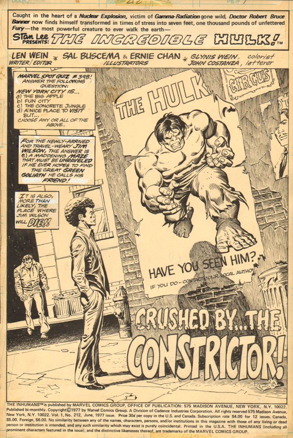 My mind is still trying to grasp the fact that I was fortunate enough to get my hands on a splash page from my favorite era of the Hulk. Sal Buscema defined the Hulk for me during my childhood and Ernie Chan's inks amaze me. The figure on this page are incredible and the detail of the scene makes this page a true gem!