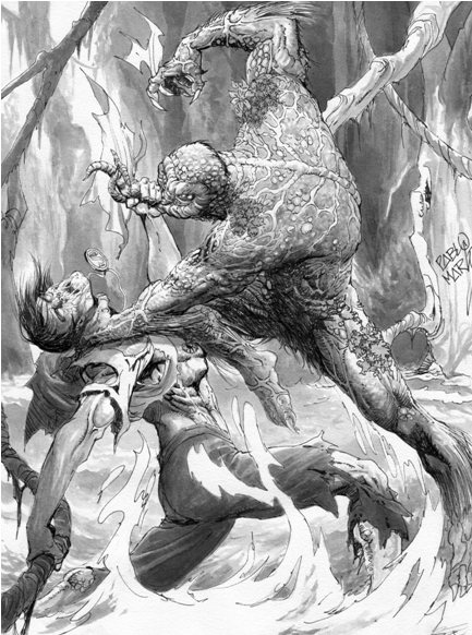 I read ESSENTIAL ZOMBIE a little over a year ago and absolutely fell in love with Pablo Marcos's work! I was determined to get something from him and finally got around to commissioning (what else?) Man-Thing battling Simon Garth, Marvel's Zombie!