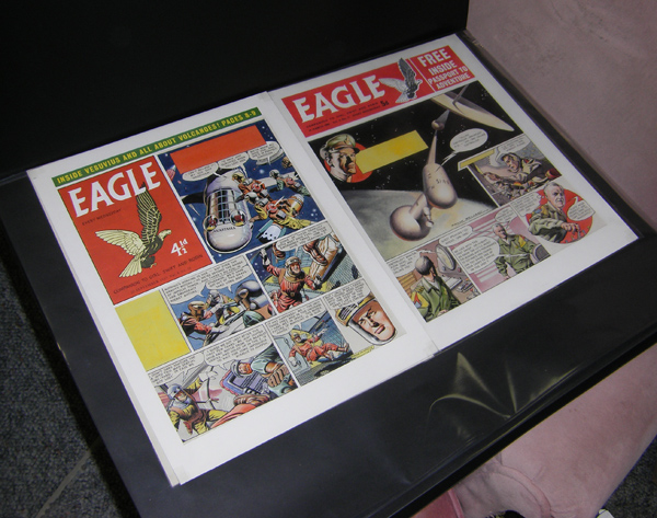 Newly arrived DAN DARE pieces reside in a portfolio whilst awaiting their trip to the framer. . .