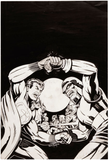 This cover was sold back in 2009 with this information.... " Description: Jack Kirby and Greg TheakstonSuper Powers#6 Superman and Darkseid Cover Original Art (DC, 1986).Darkseid battles the Super Powers and the prize is Earth. The issue was dedicated to Julius Schwartz, Gardner Fox, Mike Sekowsky, and Bernie Sachs, and was based on the 1985 TV cartoon "Super Powers: Darkseid of the Moon." This page has an overall size of 12" x 17.75". The art extends to the edges of the page (no borders) and it's in Excellent condition. Kirby, Jack: Jack Kirby (American, 1917-1994) : Jack Kirby has received world-wide recognition for his long comic book career and accomplishments. He is regarded by historians and fans as one of the major innovators and most influential creators in the comic-book medium, thus earning the nick-name "King." Among Kirby's many co-creations are Captain America, the Newsboy Legion, the Challengers of the Unknown, the Fantastic Four, the Hulk, Thor, the Avengers, the X-Men, Silver Surfer, the New Gods, and countless other memorable heroes and villains."