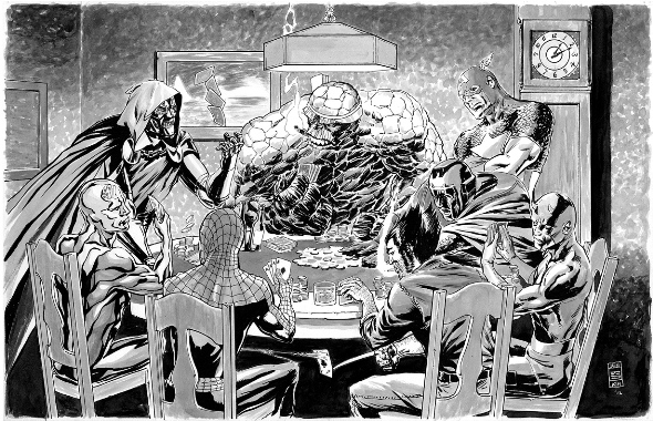 I hadn't been aware of Jun Bob Kim until seeing and amazing Invaders One Minute Later commission in a listserv. I immediately contacted him and from the first moment of our interaction until completion of the final artwork, he was both enthusiastic, friendly and incredibly creative. My only request was that he include Ben, Spidey and Logan, asking him to add other characters of his chosing. Jun came back with the idea of "A tongue-in-cheek game of poker... for the fate of the world". As with all of the artists, his putting his own artistic spin on this added immensely to the original idea. The fun continued as he sent me a pencilled rough, that clearly depicted fun hijinx including the playing cards reflected in Silver Surfer's forehead, Logan handing off a card to Spidey under the table, Kang going all in, his hand reaffirming that Spider-Man is a lousy cheater, Doom tantrumming and more..... as well as a nod to Collidge's "A Friend in Need" classic piece. He offered to add another character into the scene and we came up with a disapproving Cap looking on.
