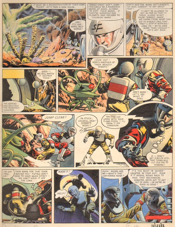 Just for the heck of it, I thought I'd post a handful of Grail pages -- pages I would love to add to my DAN DARE collection, but, alas, am not likely to any time soon.This one is from the second part of the "Terra Nova" storyline, which introduced me to Dan and Co. back in 1959. Frank Bellamy art. Sharp eyes will notice this page had a small influence on a scene in my recent COLD WAR series. So far as I know, it is not for sale, but. . . YUMMY!
