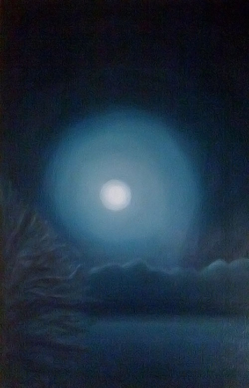 Snapshot with my iPhone of the moon picture I begna last night. This evening I've gone over the acrylics with water soluble oils. My intention is for this to have a dreamlike, hazy look. That's MURDER to achieve with acrylics, but working with oils to achieve this look is a joy. This iPhoto doesn't do the original justice. I'll probably keep working it off and on this week. Once the paint dries, I'll scan it in and get a good copy ya'll can look at and which I can post on my blog. Who knows when that will be.