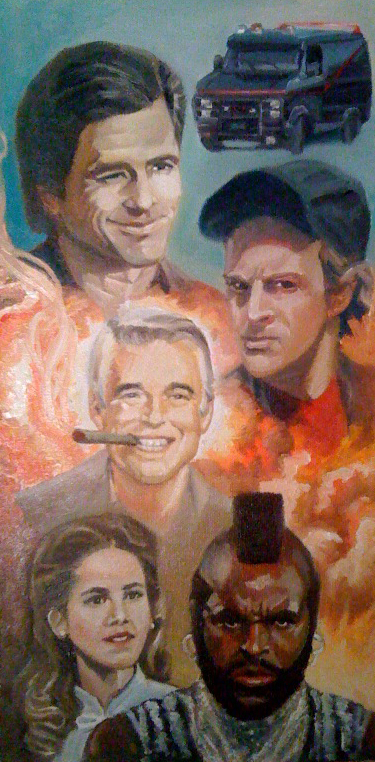 You all may be getting sick of this already, and again, not a great photograph, but it gives you an idea how I've worked the background. Tomorrow night I plan to finish the detail work. Touch-up the van, Mr. T's outfit, Peppard's cigar smoke, and Triple A's hair. Really nothing big at this point. Just some fine tuning. Then I'll let it dry so I can scan it in a few weeks or get a camera and proper lighting so I can get a decent photograph it.