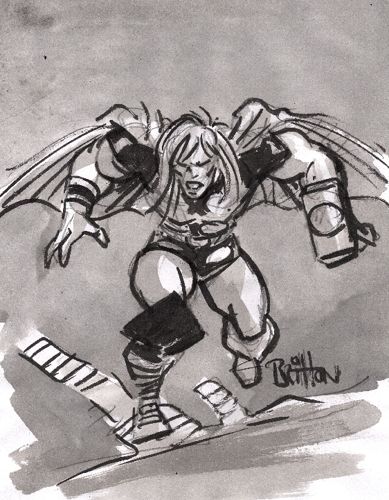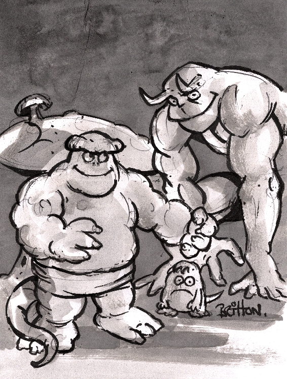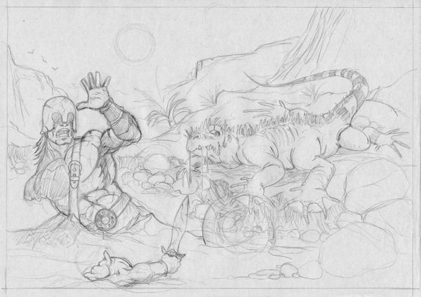 Hi guys, been a while - DT, love the terminator. JPB, your fast sketch work is still great, but the colour stuff is getting really good. Keep 'em coming, please. Arc, don't sweat it - as long as you can identify what didn't work and learn from it you're doing fine. Sebastien, coming along nicely - again, more please. Chris, Joe and Didier, seconded what Arc said - good work from all. Anyone I missed, please excuse my (increasingly) elderly memory; there's always a whole bundle of great contributors in here. Anyhoo, here's a WIP pencilled page for a work jam themed on "Monsters" - this is the D&D version of the basilisk, the dribbling six-legged monstrosity that petrifies with it's gaze. Old mate at screen left is turned to stone, if my crappy texture doesn't show that well enough. I'll bang up the finished version later on. Basilisk Creek...
