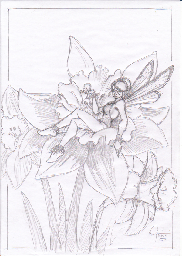 Mike, love that sloth, Bill, that caboose final is magnificent, and Ed, yea verily thy art doth rock also. Here's a quick A4 sketch I did while watching the tennis final tonight - it's for a theme jam at work, the subject is "Flowers". So, here's some daffodils -
