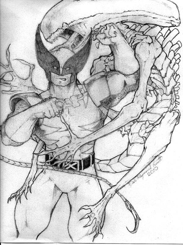 I was trying to capture Logan being annoyed with the alien attempting to pierce his adamantium laced skull with it's retractible jaws. The alien was in for a surprise when it realized it couldn't crush his skull. And, or course, Wolverine responds accordingly, while pulling the cigar from his mouth to say under his breath, "I hate bugs..." Edit- I don't like how Wolverine's head looks in this sketch. but it's a start in the right direction.