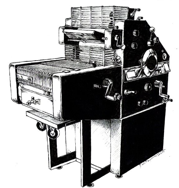 An old sketch from college days, based on the illustration from the instruction manual for the printing press.