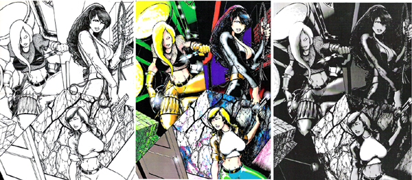Nice work Darren! :) I haven't been on to post in a while, but still checking stuff out. Here's some work I did a while back, with the original sketch and ink, combined with the digital colour and the B&W version of the coloured sketch. In hindsight I think the colouring job looks terrible and the B&W of the coloured job looks better.