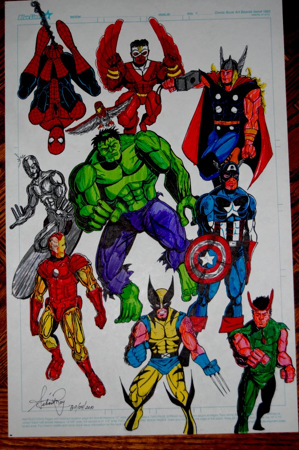 Well, this was a piece that started pretty well but, as it went along, and I got to inking it, it started to look like crap so I decided to color it with markers, which made it look worse (for several of the characters anyways).  My favorite remains Spider-Man...ah well...