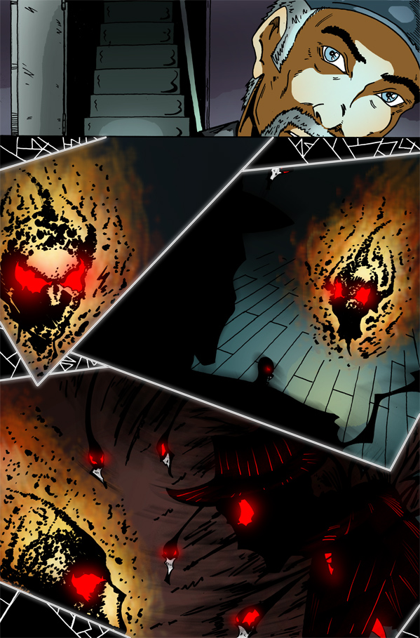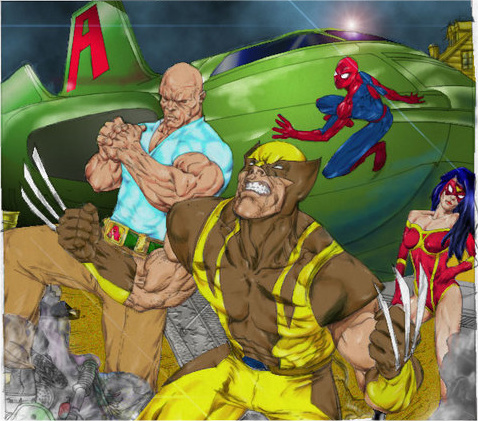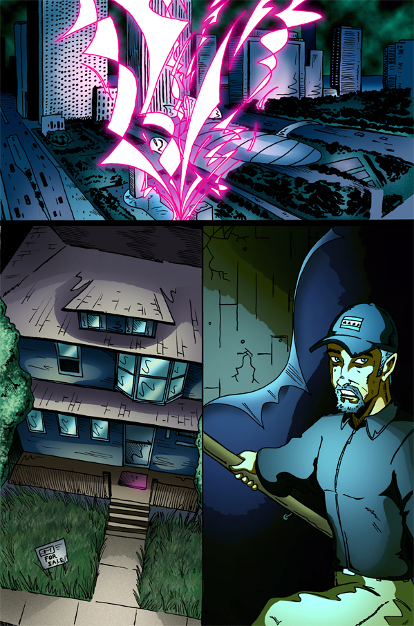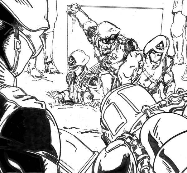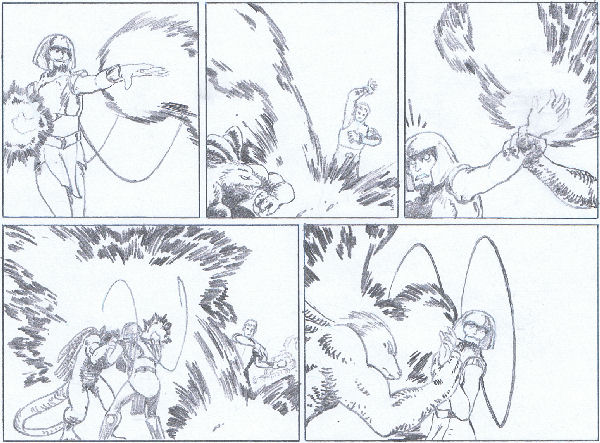 The second piece from the old scrap pile is a mock-up of one scene from an original webcomic of mine. Here, the villain from the pic above is taking on members of a super-team which I had intended to put him up against.