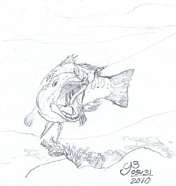 This brings to mind something that I discovered about myself. I can really be comfortable drawing at my own pace if I just sketch out a scene in my mind without much in the way of "contstuction lines" or any other sort of prop, so long as the object in the picture doesn't require much thought. Hence the baited hook on the line was followed by the bass that was about to bite down on it, then the rocks on the stream bottom, then the submerged tree trunk and undertwater weeds behind them, and the ripples barely visible on the surface of the murky stream, and so on... I have had so much more difficulty whenever I start to lay out a perpective grid to arrange objects on a street scene than when I just throw something together naturally like this. I don't know if it is a form of "artists' block" or not. Free standing figures with no background are a cinch; figures interacting with objects or the ground are not.
