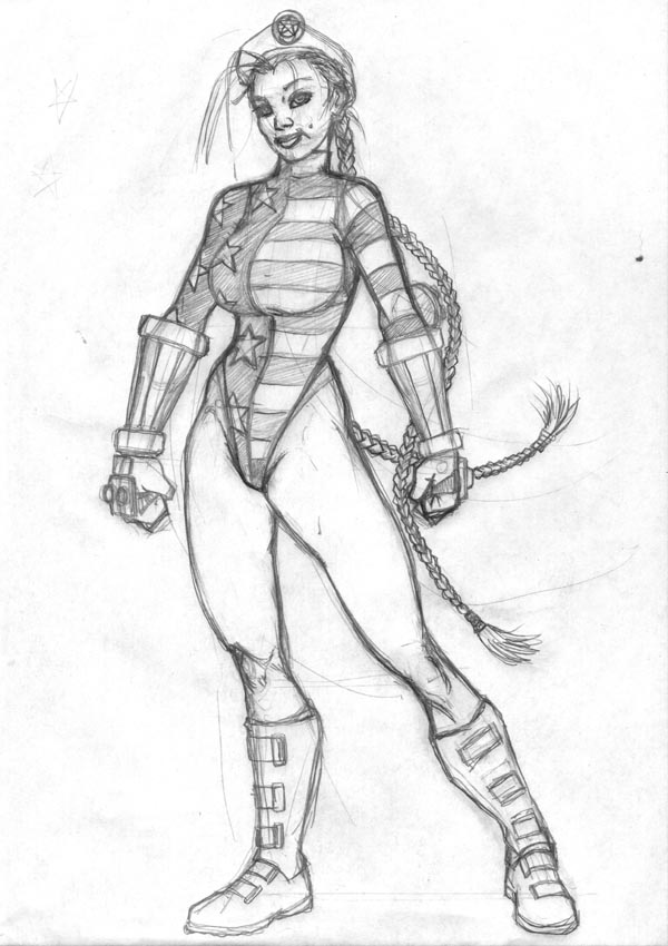 Carmen, that bass illustration is great! More of those, please - really like it. Didier, love the coloured final - lovely little picture. Mikael, I'm green with envy - your Batman pages are superb. Gil, great Eradicator. The colours finish off a great drawing just fine. JT, more Spidey please! Here's my latest, gang. Found a good tutorial on gradient colouring in PS, so did this one of Cammy to try it out. It worked so well (I think, anyway) Red Sonja gets the treatment next! Here's the sketch layout: